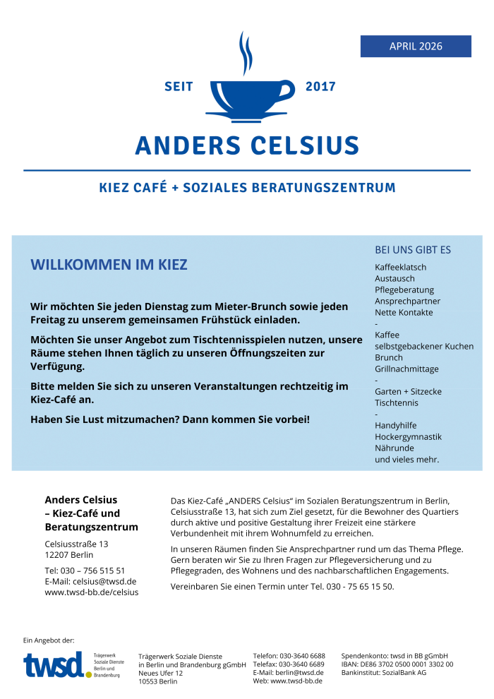 Am 12. September 2016 stellte die Trägerwerk Soziale Dienste in Berlin und Brandenburg gGmbH das künftige Soziale Beratungszentrum und Kiez-Café "ANDERS Celsius" in Berlin-Lichterfelde vor. Nach Ab…