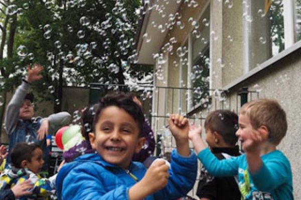 Hunderte schillernder Seifenblasen, bunte Luftballons, Blumen und Girlanden kündeten am 25. Mai von der festlichen Eröffnung der Kita Knirpsmaus in der Kongostraße 46, im Afrikanischen Viertel in Berlin-Wedding. Die Kita, benannt nach der Afrikanischen Zwergmaus, dem kleinsten Nagetier der Welt, besteht seit dem 15.09.2015.