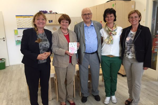 V.l.n.r.: Geschäftsführerin der TWSD in BB gGmbH Silvia Schmidt, Bruni Wildenhein-Lauterbach, MdA (SPD), Vorstandsvorsitzender der TWSD AG Rudolf Dadder, pädagogische Leiterin Beatrice Brauns und Projektleiterin Astrid Grasnick in der Kita Knirpsmaus
