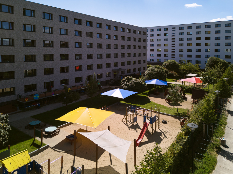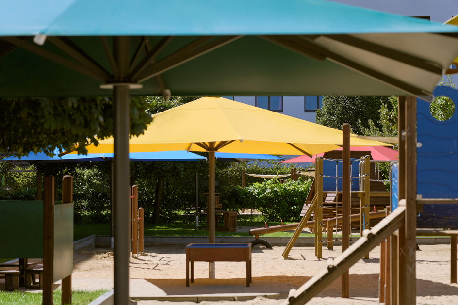 Dank der finanziellen Unterstützung der DKLB-Stiftung und des Paritätischen Wohlfahrtsverbandes LV Berlin können sich die Kinder unserer Kita über fünf große festinstallierte Allwetterschirme im Garten freuen.