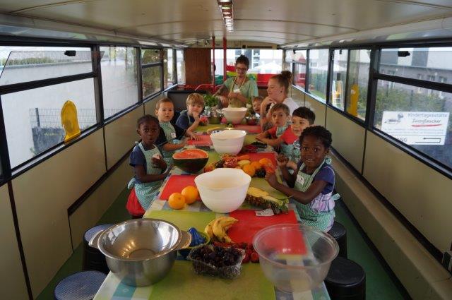 Unsere ABC-Schützen konnten an einem Kochkurs im KIMBAmobil direkt auf unserem Kitagelände teilnehmen. Sie lernten dabei viele Obst- und Gemüsesorten kennen und staunten, was es so alles gibt! Es wurde eifrig geschält, geschnippelt, geraspelt und gekocht. Zum Schluss stand eine selbst zubereitete, lecker duftende und gesunde Mahlzeit auf dem Esstisch in der oberen Etage des Busses: Rucki-Zucki-Spaghetti, dazu ein Obstsalat und ein selbstgepresster Multivitaminsaft!