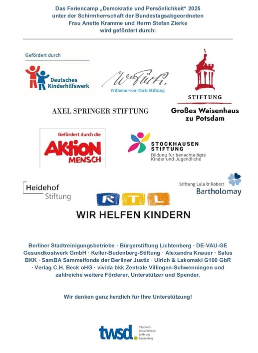 Wir freuen uns sehr, dass das Feriencamp „Demokratie und Persönlichkeit“ auch in diesem Jahr wieder ein voller Erfolg war. Dies verdanken wir der Unterstützung zahlreicher Stiftungen und Förderer aus ganz Deutschland, denen unser herzlicher Dank gilt.