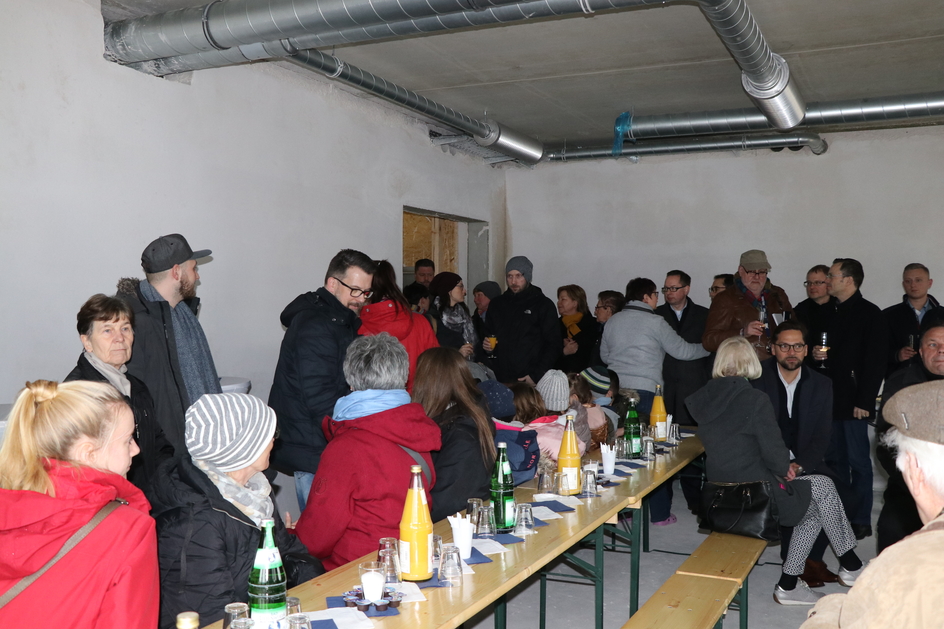 Für ein musikalisches Ständchen sorgten die Kinder der Kita Zwergtaucher, die mit ihren Erziehern extra angereist waren, um für die Gäste und Handwerker zu singen und um sich auf der Baustelle umzuschauen. Bei einem Imbiss konnten die Gäste miteinander ins Gespräch kommen und sich umfassend über das Bauprojekt zu informieren.